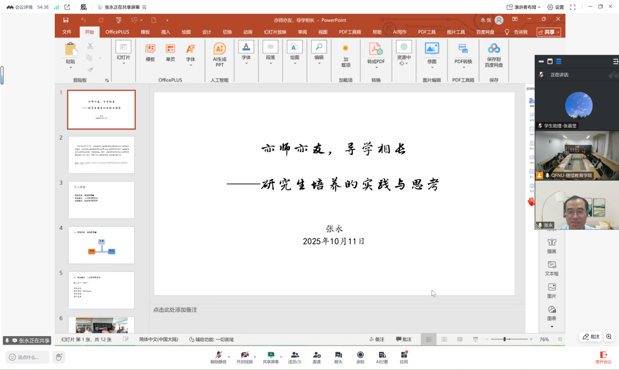 张永教授结合研究生教育教学管理工作以及指导研究生的亲身经历,从师生关系、专业能力、交往能力三个维度分享了研究生培养的实践与思考,提出了“学生即同事”“人力资本即支点”“社会资本即杠杆”等观点。这些观点对更好地处理师生关系以及提升研究生导师的导学能力都具有重要启发意义。