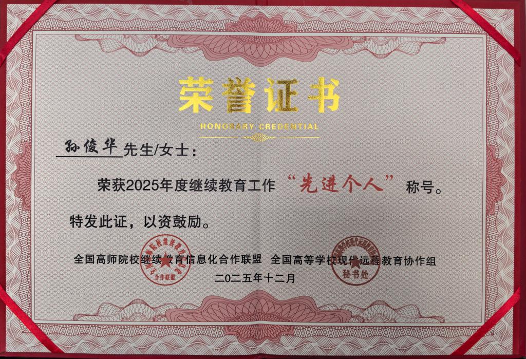 孙俊华同志荣获“先进个人”称号,这是联盟对我校继续教育事业高质量发展的高度认可与充分肯定。